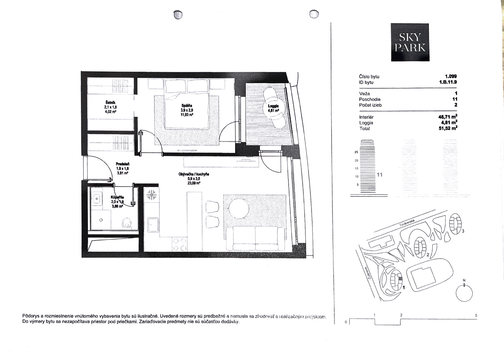 celková úžitková plocha: 54 m2 (byt 46,7 m2 + loggia 4,8 m2 + pivnica 2,5 m2)
