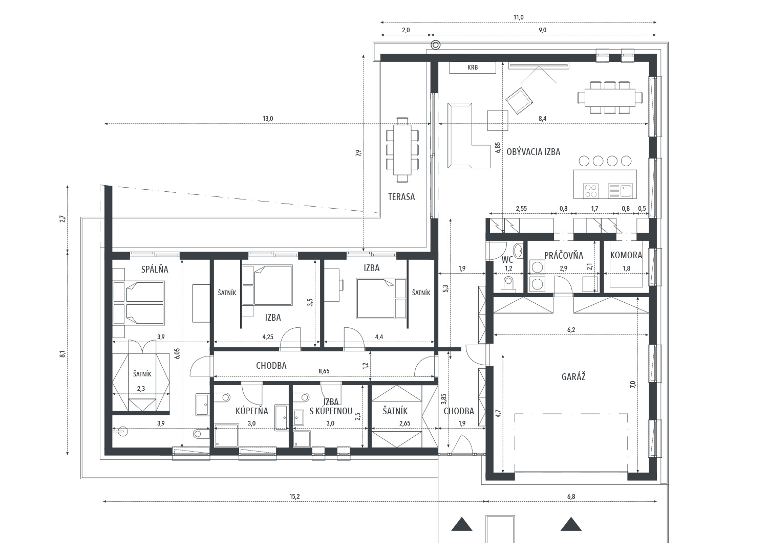 Z jednotlivých izieb sú vstupy na terasu a záhradu. V zadnej časti záhrady je samostatná brána s prístreškom pre auto, no táto časť poskytuje rôzne možnosti využitia v budúcnosti, napr. výstavba ďalšieho plnohodnotného domu, prípadne krytého SPA alebo bazénu.
